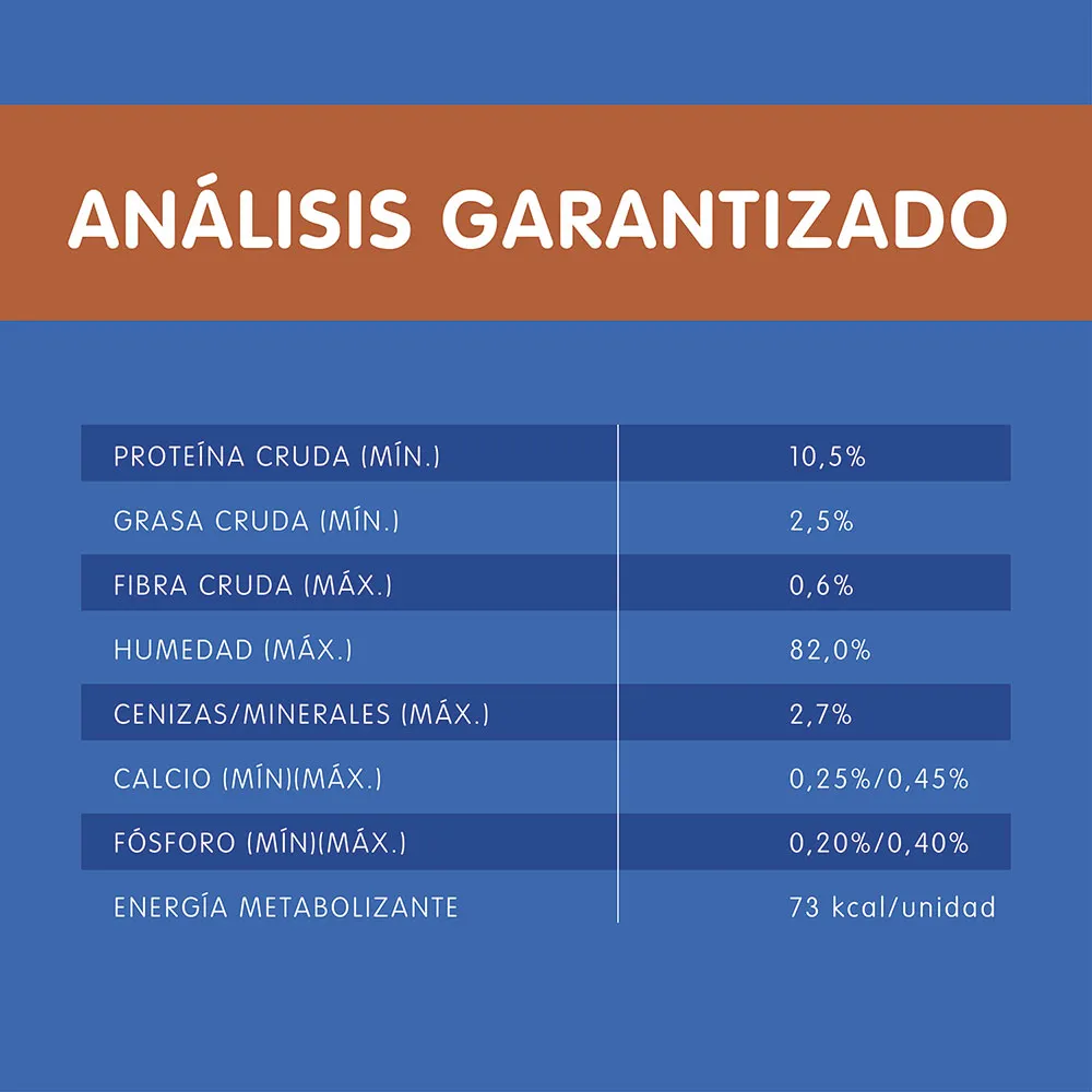 Agua suficiente para proceso, carne de pollo congelada, gluten de trigo y/o harina de soya y/o harina de menudencias de pollo, vísceras de pollo y/o vísceras de cerdo congeladas, almidón de maíz, carne de sardina congelada, glicina, dextrosa y/o xilosa, fosfato bicálcico, sal*, inulina, vitaminas (A, B1, B2, B3, B5, B6, B7, B9, B12, D3, E, K3), cloruro de potasio, taurina, minerales [(sulfatos: zinc, hierro, manganeso, cobre), minerales de alta absorción/quelados (proteinato de zinc y/o complejo de zinc glicina, proteinato de hierro y/o complejo de hierro glicina, proteinato de manganeso y/o complejo de manganeso glicina, proteinato de cobre y/o complejo de cobre glicina, proteinato de selenio y/o complejo de selenio glicina), yodato de calcio, selenito de sodio], carbonato de calcio, cloruro de colina. *Sal (mín./máx.) 0.1% / 0.6%.