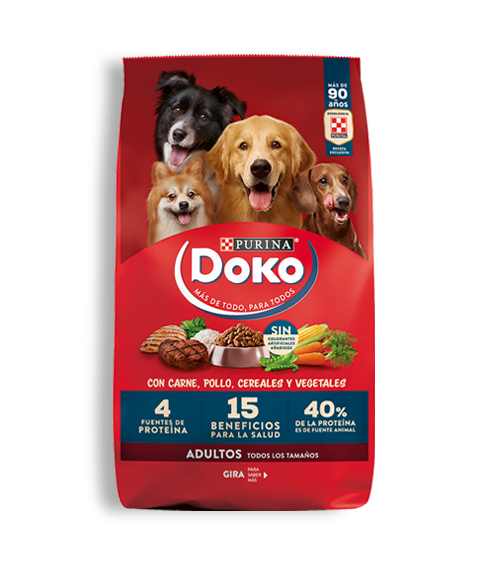 Alimento seco para cachorros de todos los tamaños DOKO® con Carne, Pollo, Cereales, Vegetales y Leche. Un alimento 100% completo y balanceado con 5 fuentes de proteína, de las cuales 40% es de fuente animal. Un solo producto con 15 beneficios que ayudan a la salud, como músculos fuertes, piel sana, pelaje saludable, y más. Ahora sin colorantes artificiales añadidos.
