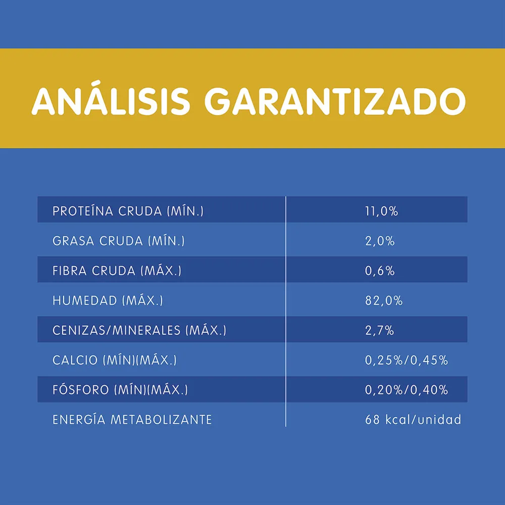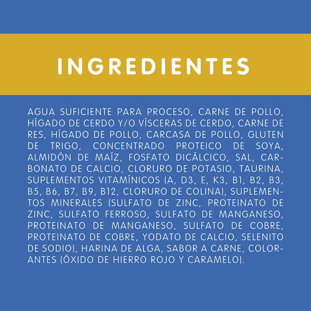 Agua suficiente para proceso, carne de pollo, gluten de trigo y/o gluten de maíz y/o harina de soya, carne de pescado (tilapia y/o sardina y/o atún), hígado y/o corazón de pollo, almidón de maíz, ortofosfato y/o carbonato de calcio, hígado y/o vísceras de cerdo, saborizante cárnico artificial y natural, sal**, vitaminas (A, D-3, E, K-3, Complejo B, cloruro de colina), cloruro de potasio, taurina, minerales , levadura de cervecería inactiva.