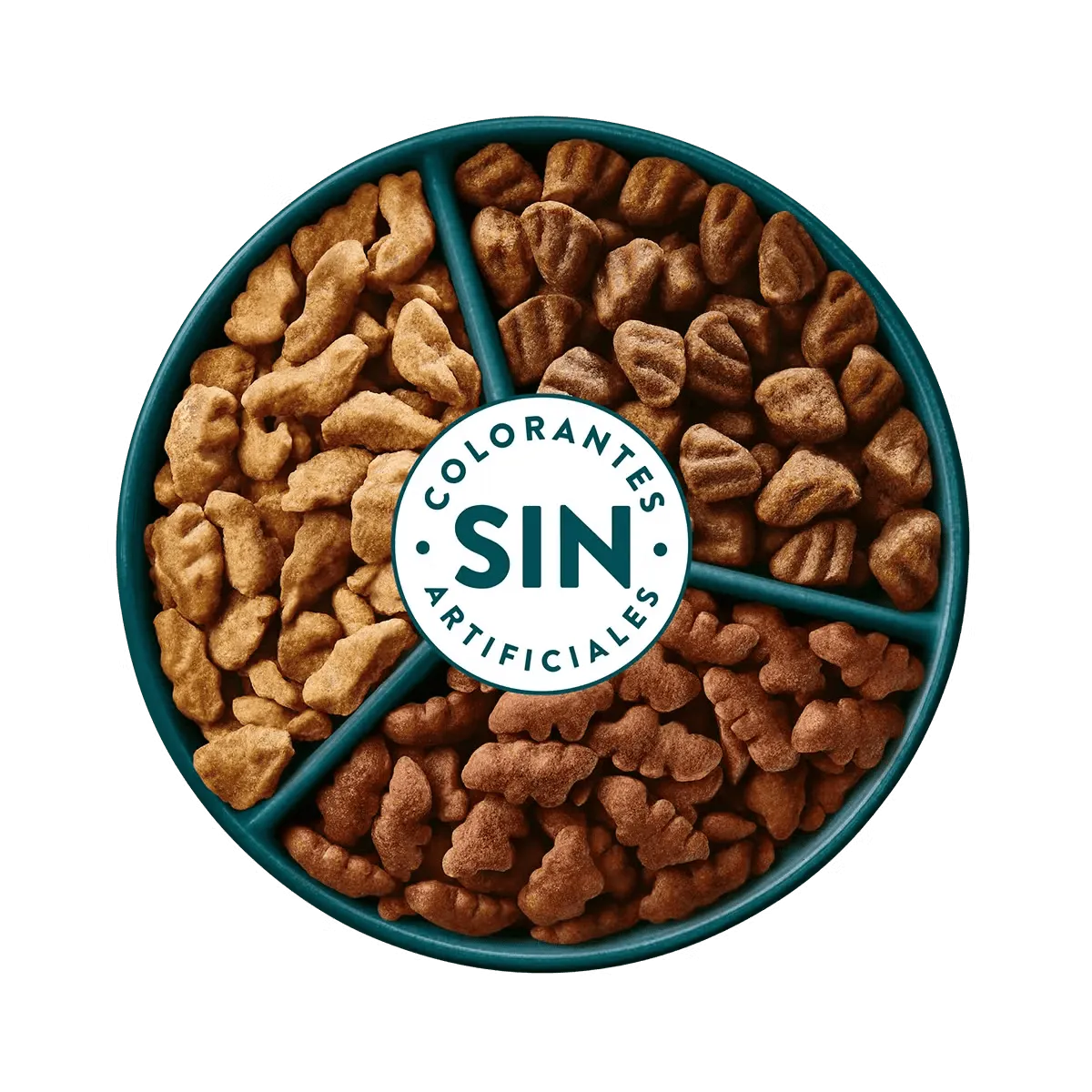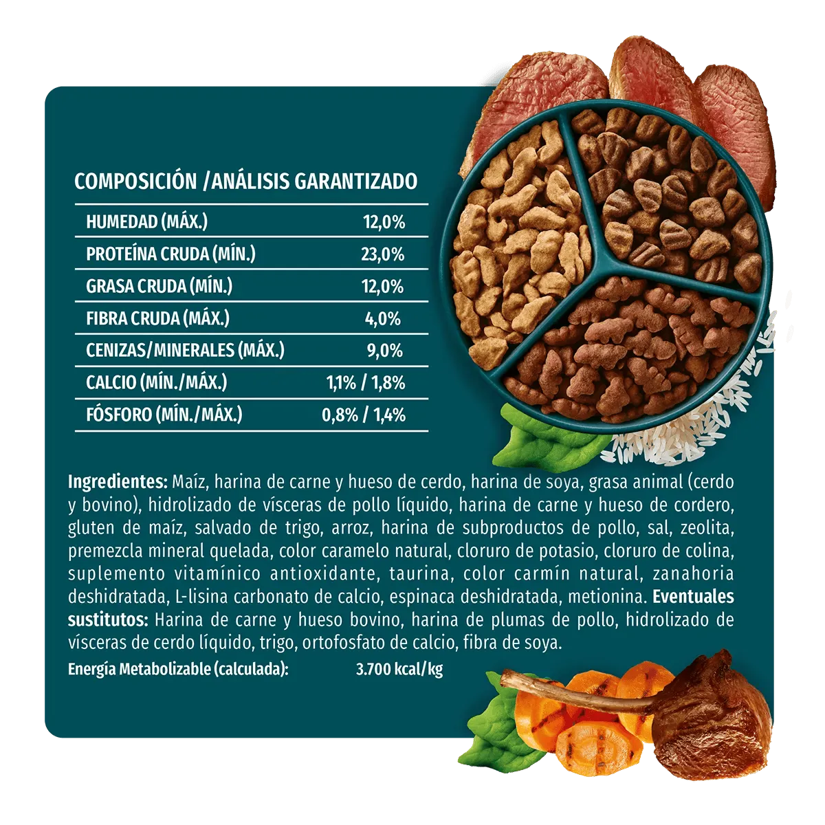Maiz, harina de carne y hueso de cerdo, harina de soya, grasa animal (cerdo y bovino), hidrolizado de visceras de pollo líquido, harina de carne y hueso de cordero, gluten de maíz, salvado de trigo, arroz, harina de subproductos de pollo, sal, zeolita, premezcla mineral quelada, color caramelo natural, cloruro de potasio, cloruro de colina, suplemento vitamínico antioxidante, taurina, color carmín natural, zanahoria deshidratada, L-lisina carbonato de calcio, espinaca deshidratada, metionina.