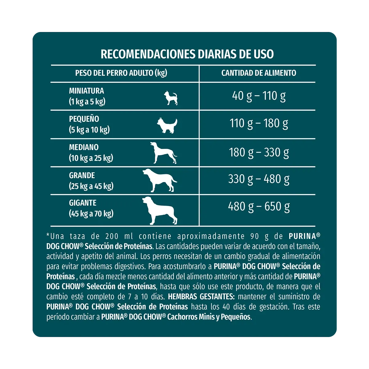 Selección de Proteinas, Las cantidades pueden variar de acuerdo con el tamaño, actividad y apetito del animal. Los perros necesitan de un cambio gradual de alimentación para evitar problemas digestivos. Para acostumbrarto a PURINA® DOG CHOW